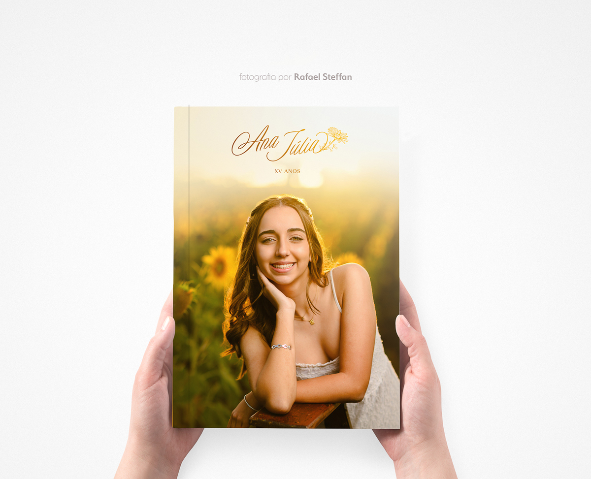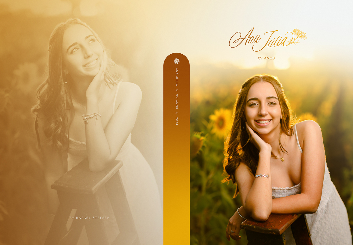Para o design de capa do álbum de 15 anos da Ana Júlia utilizamos uma tipografia manuscrita, delicada e moderna, trabalhando o elemento do girassol como tema principal, trazendo a composição todo o romantismo pelos girassóis. Confiram no final do ensaio as fotos da belíssima capa que produzimos especialmente para o álbum dos 15 Anos da Ana Júlia.