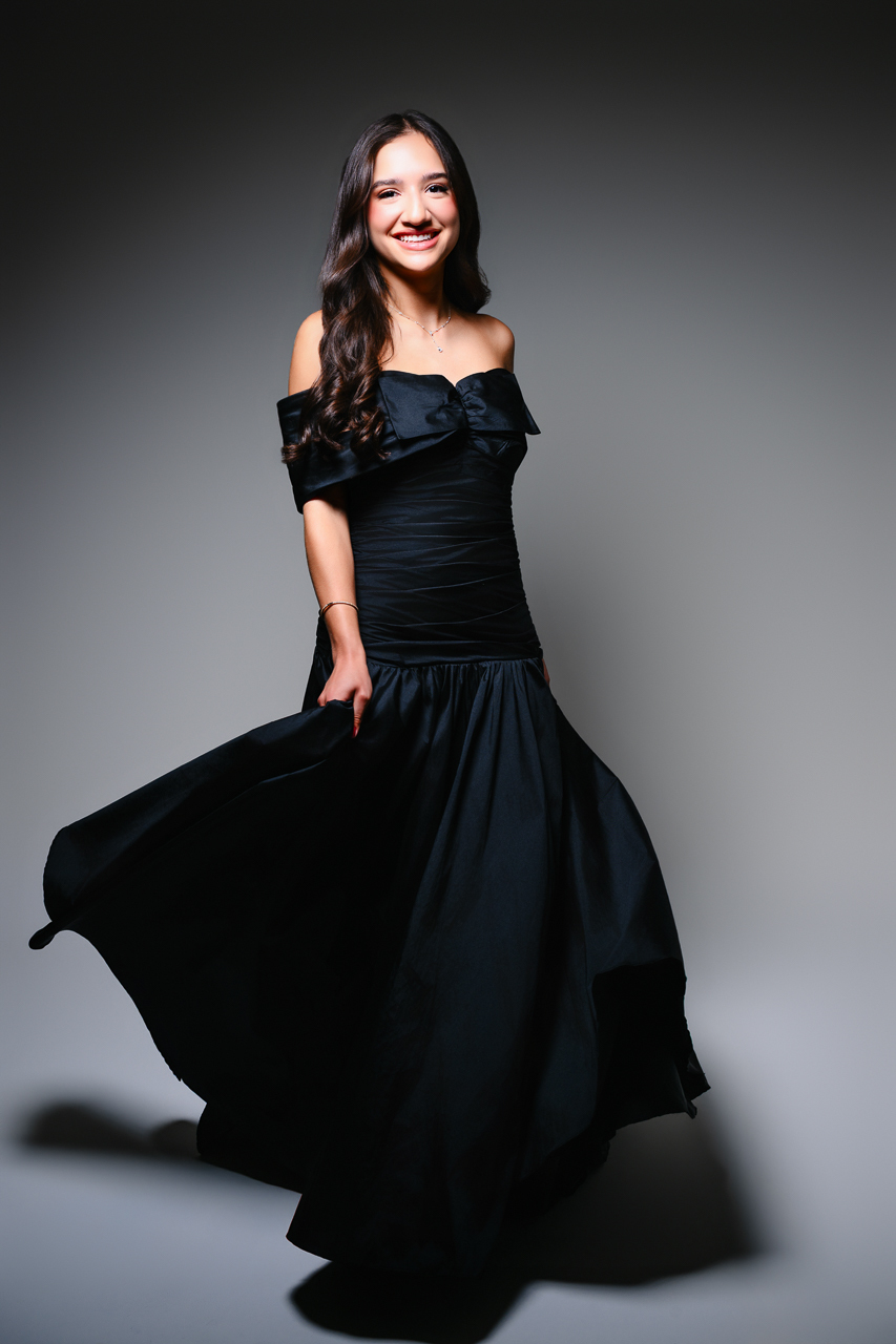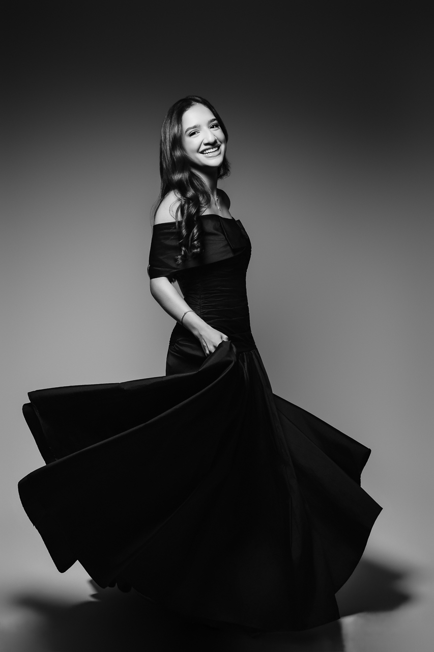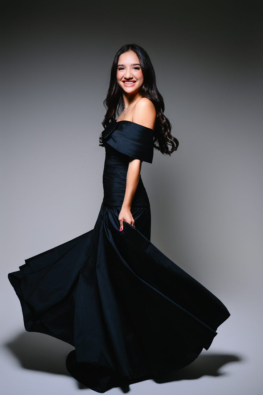 Destaque especial para o lindo vestido preto de festa que fotografamos no estúdio com um esquema de luz para valorizar a profundidade de luz e sombras nas fotos coloridas e preto e brancas.