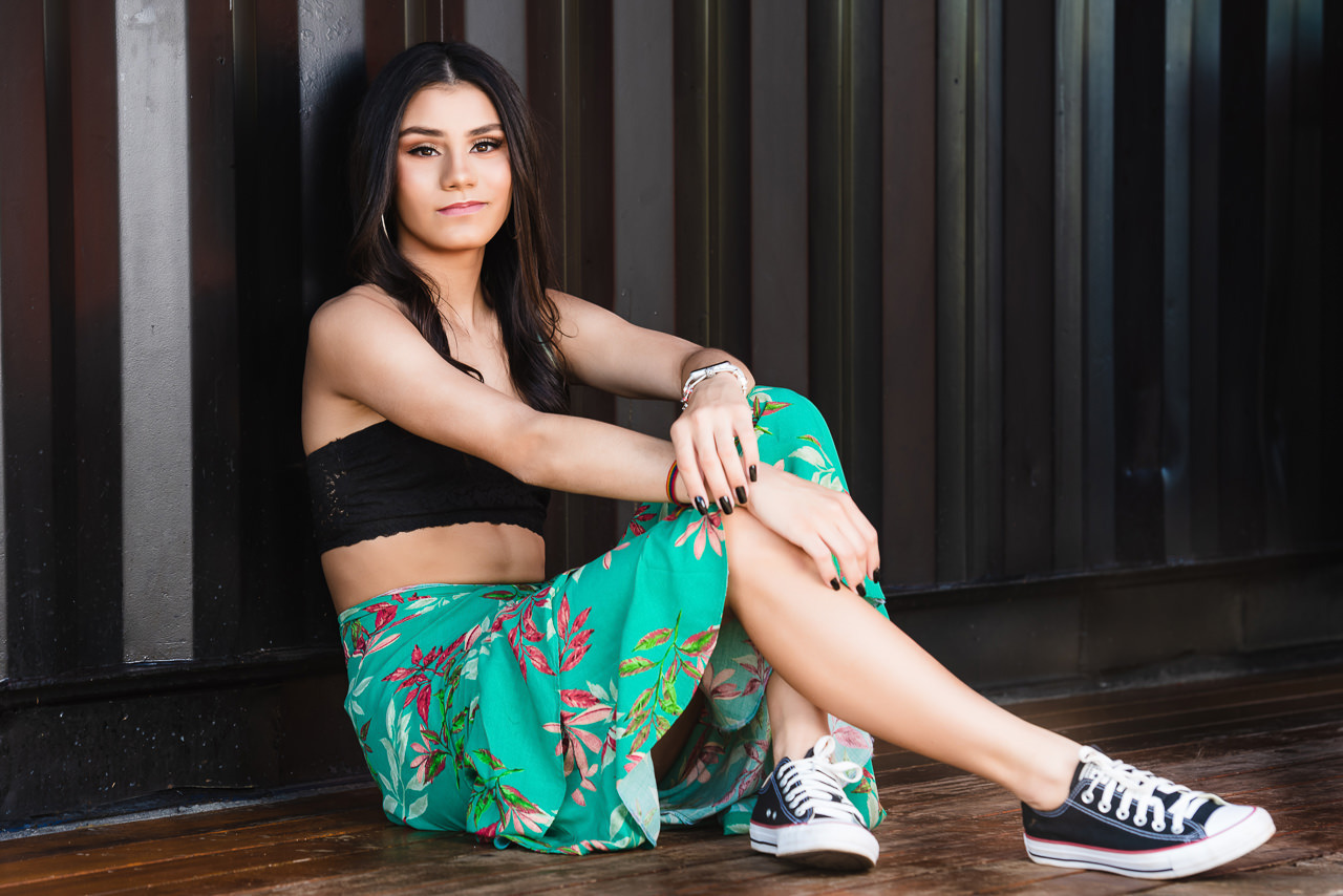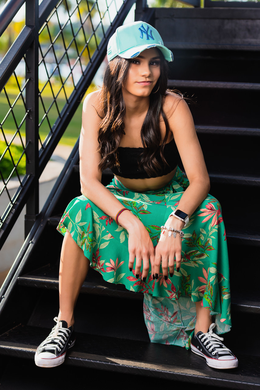 Tivemos como ponto de partida as escadas da Hamburgueria Geleia, local que possui uma escada de metal preta que veio de encontro com o look mais casual da Júlia, que sem medir esforços entrou no clima com várias poses e acessórios. Usamos também um pouco da área verde para produzirmos retratos bem expressivos.